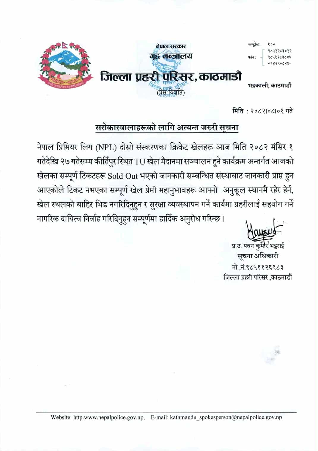 एनपीएलको सबै टिकट बिक्री भएकाले भीड नगर्न काठमाडौँ प्रहरीको अनुरोध