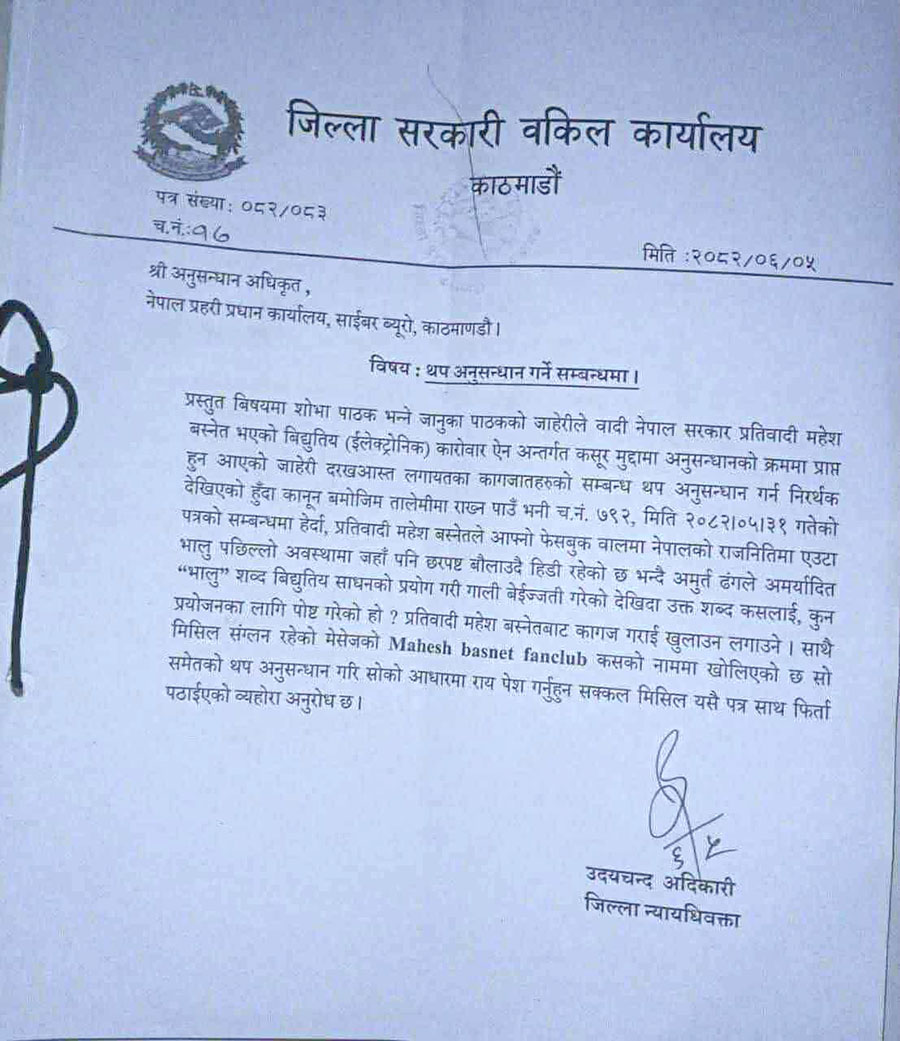 महेश बस्नेतमाथि विद्युतीय कारोबार ऐन अन्तर्गत कसुर मुद्दामा अनुसन्धान अगाडि बढाउन सरकारी वकिलको प्रहरीलाई पत्राचार