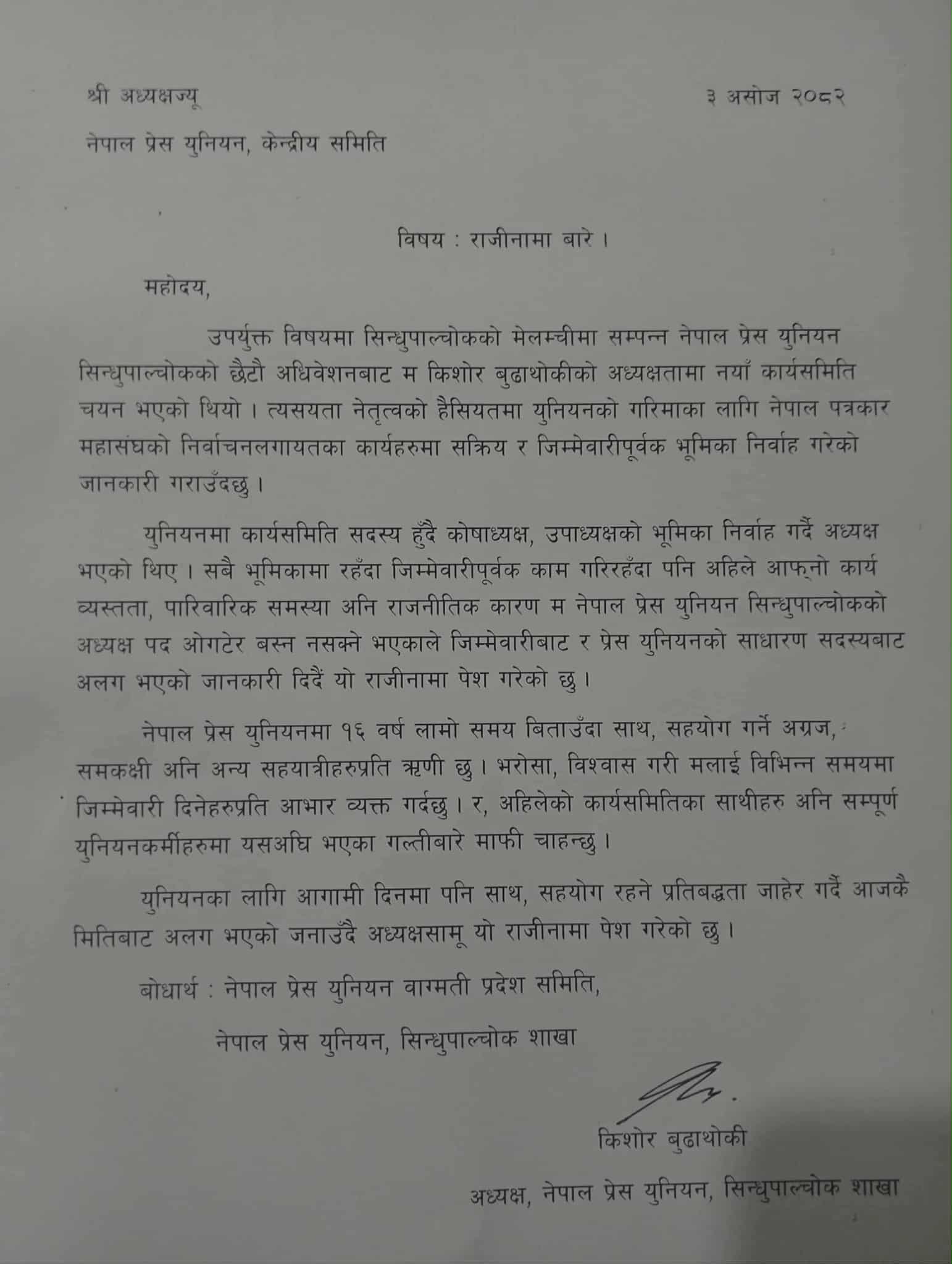 नेपाली काग्रेस आवद्ध पत्रकारका सिन्धुपाल्चोक अध्यक्षले राजनीतिक कारण देखाउदै पद छाडे