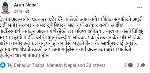 सचिवालयको बैठक राखेर समीक्षा गर्न एमाले पोलिटब्यूरो सदस्य नेपालको माग