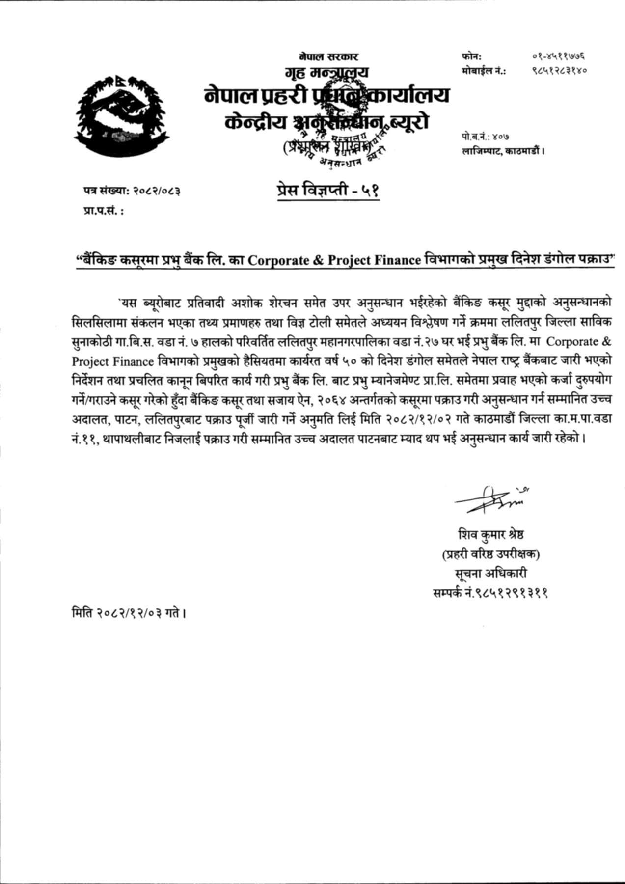 प्रभु बैंकका विभागीय प्रमुख दिनेश डंगोल पक्राउ, बैंकिङ कसूरमा अनुसन्धान जारी
