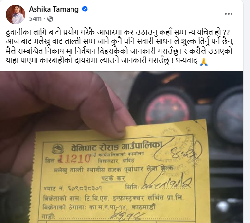 शपथ नगर्दै आशिकाको सामाजिक सञ्जालमा निर्देशन- मलेखु–ताल्ती सडकखण्डमा सवारी शुल्क नलिनू